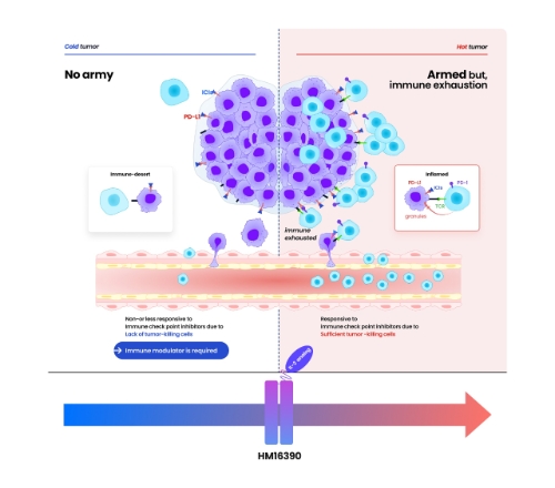 HM16390은 T 세포의 증식 및 활성화를 유도하는 기전으로 특히 종양미세환경에서 면역관문억제제에 반응하는종양침윤림프구(TIL)의 수를 증가시켜 면역원성이낮은 'cold tumor'를 면역원성이 높은 'hot tumor'로전환, 항종양 효과를 극대화하도록 설계됐다.
