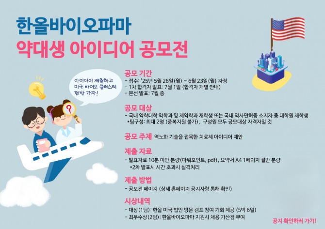 공모전 수상자는 제약바이오 분야의 현장 경험을 통해 다양한 진로를 경험해볼 수 있는 혜택이 주어진다. 대상 수상팀은 5박 6일 동안 한올바이오파마의 미국 법인 'HPI'와 글로벌 바이오 기업, 현지 연구소 탐방을 통해 직무를 탐색하고, 멘토링 기회를 얻을 수 있다.