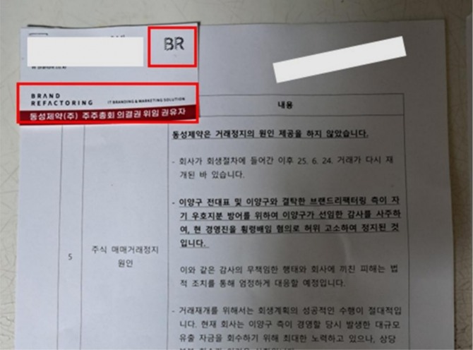 이와 함께 게재한 사진에는 동성제약의 최대주주이자 현재 경영진과 갈등을 겪고 있는 브랜드리팩터링의 CI와 함께 동성제약 주주총회 의결권 위임 권유자라는 명함도 공개했다.