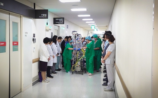 이날 주웅 이대서울병원장을 비롯해 구종모 간호부원장과 간호사, 의료기사 등 병원 내 다양한 분야의 교직원이 함께 참여했다. 이들은 기증자가 잠시 머물렀던 중환자실부터 수술실 앞 복도까지 두 줄로 서서 A씨가 수술실로 들어가는 순간 짧은 묵념이나 고개 숙임으로 조용히 감사와 경의를 표했다.
