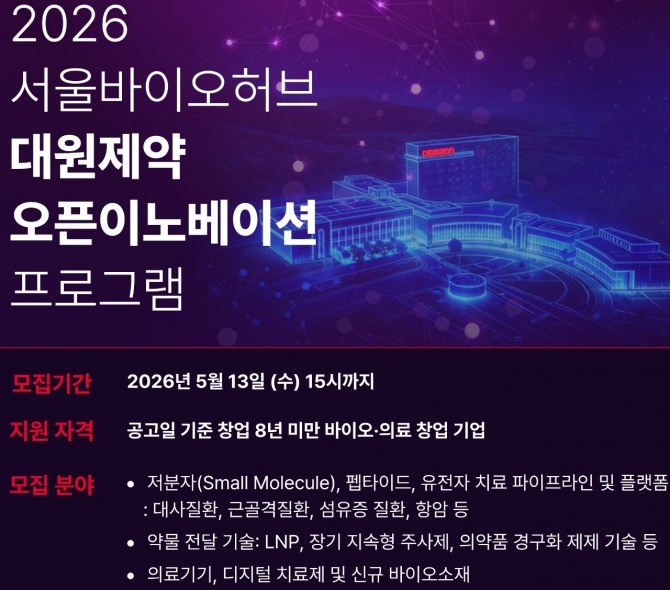 최종 선정 기업은 2곳이며 대원제약 R&D 인프라를 활용한 공동 연구 및 PoC를 비롯해 액셀러레이터 연계를 통한 글로벌 진출 지원, 서울바이오허브 입주와 임대료 지원 등의 혜택을 받게된다. 또 대원제약과 연구진들과 1년간 협력해 PoC 수행과 멘토링 지원을 받는다. 참가 신청은 서울바이오허브 누리집에서 오는 5월 13일(수) 오후 3시까지 가능하다.