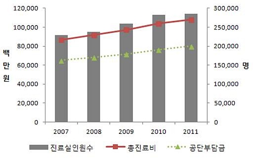 총진료비는 2007년 865억원에서 2011년 1081억원으로 연평균 5.7% 증가했으며, 공단부담금도 2007년 650억원에서 2011년 801억원으로 연평균 5.4% 증가했다.