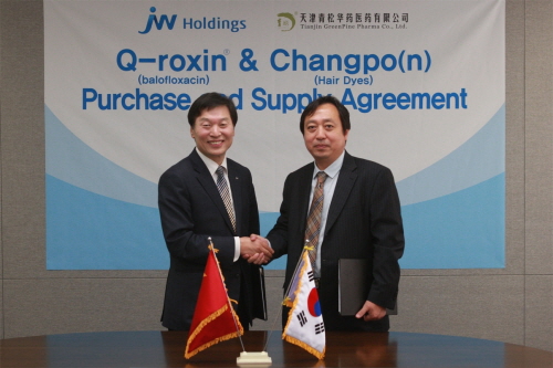 JW홀딩스가 천진그린파인제약에 수출하는 제품은 국산 4호 신약인 퀴놀론계 항균제 큐록신과 프리미엄 염색약 창포엔이다.
