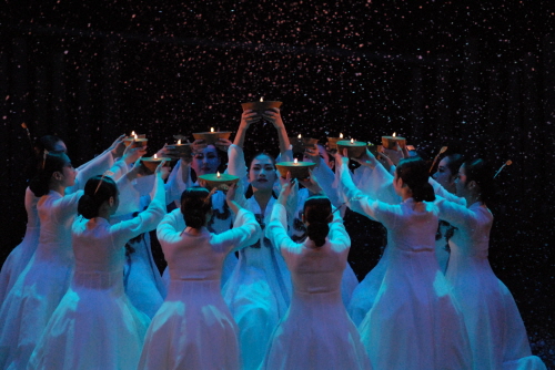 이미지 확대보기서정적 춤 선의 변화는 달밤의 서정과 맞닿아 있고, 긴 기다림과 동경은 간절한 기도로 이어진다. 신목(神木)에 대한 정성은 다양한 담론으로 이어진다. 흑백의 절묘한 복식의 조화는 한국 서정에 걸맞은 조명과 더불어 종이꽃이 소생할 신명을 토해낸다. 그녀는 바람을 불러오고 현대성을 획득한 샤먼 댄스는 축약된 기원의 깊은 묘미를 느끼게 한다.