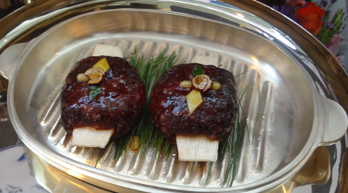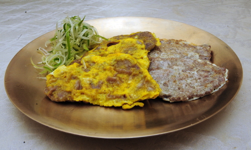 ② 밀가루를 빈틈없이 고루 잘 묻히고 계란물에 적셔 들기름을 둘러 지져 내는데 고기의 두께에 따라 불조절이 가장 중요하다. 불이 너무 세면 고기가 익기 전에 계란물만 타고 불이 너무 약하면 지지는 중에 고기에서 핏물이 많이 올라와 모양을 망치기 쉽다.
