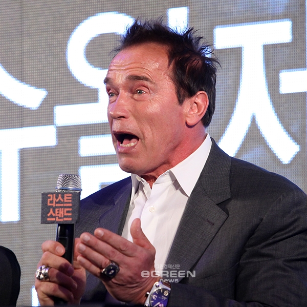 [글로벌이코노믹=유흥선기자] 배우 아놀드 슈왈제네거가 20일 오후 서울 여의도 콘랜드 서울 그랜드 볼룸에서 영화 <라스트 스탠드>의 국내 개봉을 앞두고 홍보 및 공식 내한기자회견에서 김지운 감독의 촬영장을 방문한 소감을 전하고 있다.