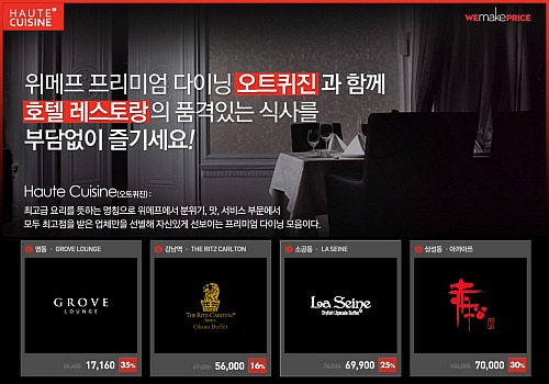 이미지 확대보기‘오트퀴진’을 통해 판매하고 있는 호텔 레스토랑 이용권은 ▲조선호텔 직영 레스토랑 ‘그로브 라운지’ ▲리츠칼튼 서울 뷔페 ‘옥산’ ▲롯데호텔 서울 ‘라세느’ ▲오크우드 프리미어 호텔 ‘아까마쯔’의 식사권으로 이 4곳은 위메프가 분위기와 맛, 서비스 수준을 기준으로 엄선한 최고의 레스토랑이다.