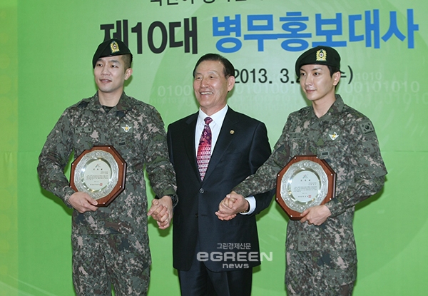 [글로벌이코노믹=유흥선기자] 박창명 병무청장과 상추-이특이 27일 오전 서울 영등포구 신길동 서울지방병무청 대회의실에서 열린 제10회 병무홍보대사 위촉패를 받고 기념촬영을 하고있다.