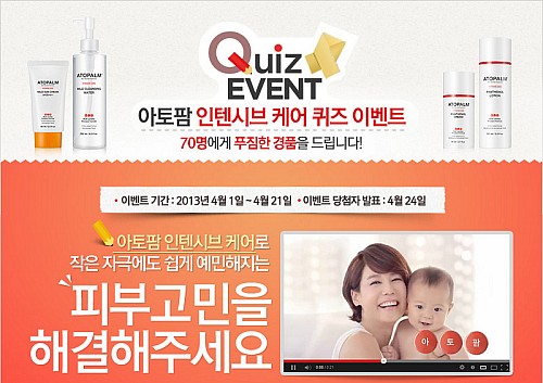 이번 진행되는 이벤트는 제품명 빈칸 채우기, 인텐시브 케어 라인 중 나에게 딱 맞는 제품 찾기 등이며, 퀴즈를 푼 뒤 이벤트 내용을 페이스북에 공유하면 당첨될 기회가 높아진다. 이벤트 응모자 중 총 70명을 추첨해 1등(1명) 신세계 상품권 50만원, 2등(2명) 침구 청소기, 3등(5명) 아토팜 인텐시브 케어 4종세트 등 푸짐한 상품을 증정한다.