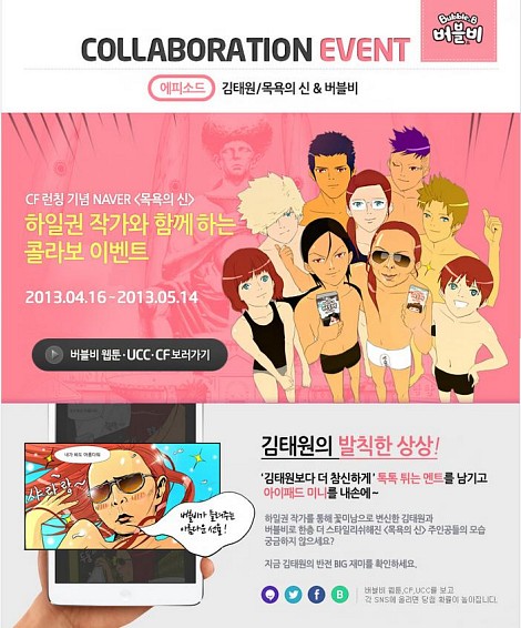 이번 콜라보 이벤트를 통해 '목욕의 신' 캐릭터 8명과 버블비 모델 김태원이 등장하는 버블비 웹툰 9편 그리고 작가 하일권의 인터뷰 영상이 포함된 웹툰 메이킹 영상을 공개한다.