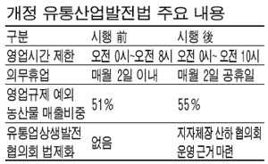 24일부터 발효되는 유통법 개정안은 대형유통업체 개점 시간을 오전 8시에서 오전 10시로 늦추고, 의무 휴업일을 월 2회로 일요일을 포함한 공휴일로 정하는 것을 골자로 하고 있다.