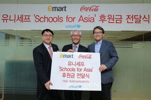 [글로벌이코노믹=홍정수기자] (주)이마트(대표이사 허인철), 코카-콜라 음료(주)(대표이사차석용), 유니세프 한국위원회는 30일 이마트 본사에서 유니세프의 ‘Schools for Asia(아시아에 희망의 학교를 선물하세요)’ 프로그램에 3천만원을 기부하는 전달식을 진행했다.