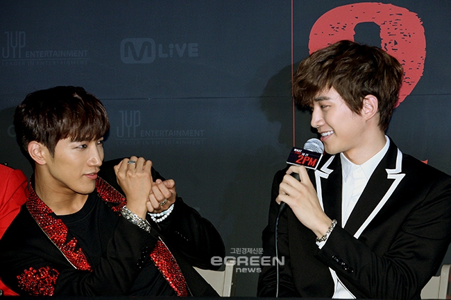 [글로벌이코노믹=유흥선기자] 보이그룹 2PM이 22일 오후 서울 송파구 잠실 실내체육관에서 열리는 ‘2PM LIVE TOUR in SEOUL - The Grand Finale’ 단독 콘서트에 앞서 기자회견에서 준호가 첫 영화 감시자들 영화배우 데뷔에 촬영감독 퍼포먼스를 선보이고 있다.