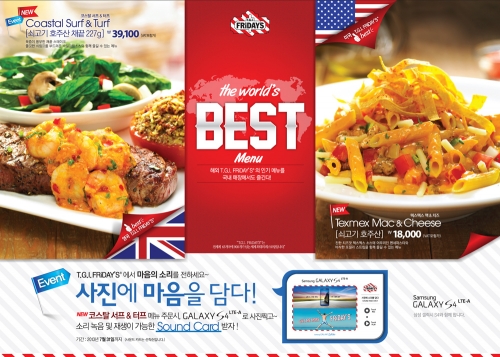 한편 TGI프라이데이스는 신제품 출시를 기념해 오는 31일까지 삼성전자와 ´사운드카드´ 제휴 프로모션을 진행한다. ´코스탈서프&터프 스테이크´ 구매 시 갤럭시S4의 ´Sound&Shot´기능을 활용한 사운드카드 액자를 증정하며, 갤럭시S4를 소지한 고객에게는 메인 메뉴 주문 시 ´케이준 후라이드 치킨샐러드´를 무료로 제공한다. 또 삼성전자 홈페이지 이벤트 페이지에서는 ´잭다니엘 찹스테이크´ 무료 쿠폰을 배포한다.