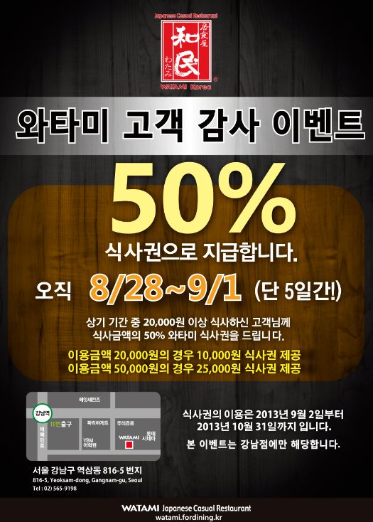 이번 이벤트는 오는 28일(수) 부터 9월1일(일) 까지 진행되며, 이벤트 기간 내 와타미 Korea강남점에 방문한 고객들에게 식사금액의 50%의 와타미 식사권을 증정한다. (단, 2만원 이상 주문 고객에 한함)