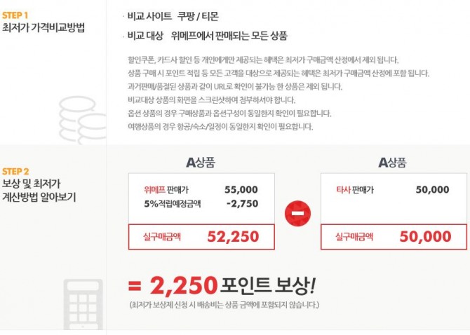 티몬의 소셜최저가보상제와 위메프의 차이는 보상액과 보상 기간만 다를 뿐이다. 위메프는 차액에 대한 보상액을 110%를 주는 반면 티몬은 이보다 낮은 100%만 보상해준다.