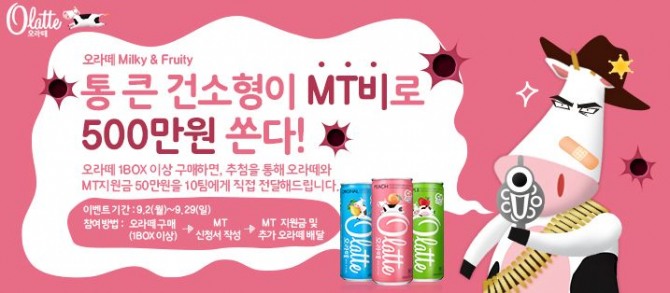 이벤트 참여방법은 오라떼를 구입한 후 학교명과 MT장소, 인원 등을 작성하면 응모할 수 있으며, 추첨을 통해 선정된 10팀의 대학교에 각각 50만원의 지원금이 전달된다.