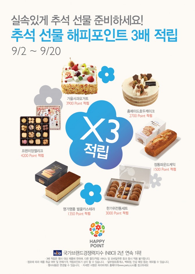 해피포인트 3배 적립 이벤트의 대상 품목은 경주산 찰보리와 찹쌀로 구워 쫄깃하고 구수한 맛이 일품인 ‘찰보리 도라야끼’를 비롯한 ‘한가위전통세트’, ‘명가명품 벌꿀카스테라’ 등의 추석선물세트와 영천 미니사과를 통째로 올린 ‘가을사과요거트’ 케이크, 국내산 제철 사과로 만든 ‘가을엔 우리사과롤’ 등의 ‘가을사과’ 제품 18종이다. 특히 추석 선물로 ‘찰보리 도라야끼(1만5000원)’ 또는 ‘한가위전통세트(2만원)’를 구매하면 각각 기존 적립금보다 3배 많은 2250 포인트와 3000 포인트를 적립해 현금처럼 쓸 수 있다.