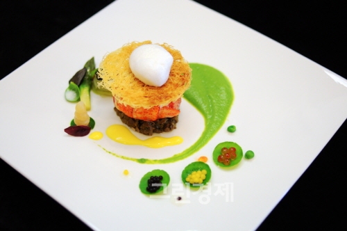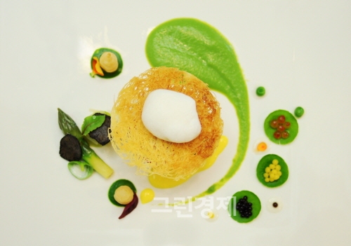 ♠ 깍지 콩퓨레와 샤프란 소스를 곁들인 랍스타