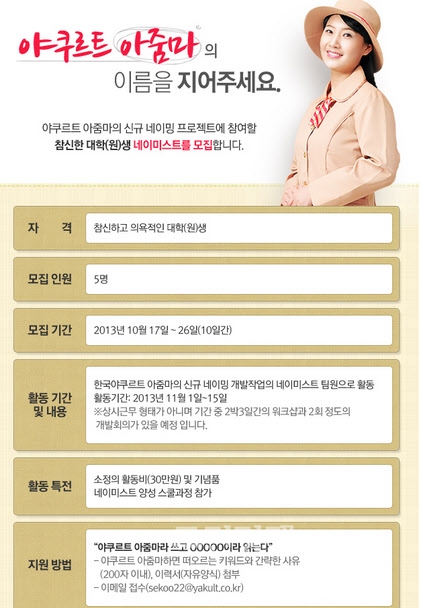 한국야쿠르트는 이번 프로젝트를 위해 '야쿠르트아줌마 네이미스트 공모전'을 개최한다고 20일 밝혔다.