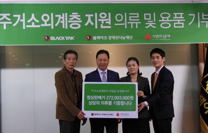 이날 기증식은 서울 금천동 가산동 블랙야크 본사에서 진행됐다. 물품은 서울사회복지공동모금회의 도움을 받아 자립하고 있는 노숙인들에게 전달될 예정이다.