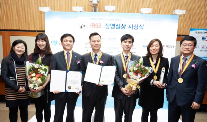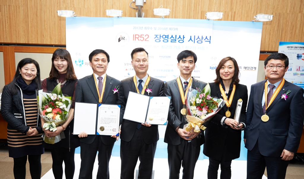 ▲'IR52장영실상'시상식에참가한(주)아모레퍼시픽한상훈기술연구원장(사진맨오른쪽),(주)아모레퍼시픽최영진메이크업연구소장(사진왼쪽에서세번째)과연구원들.