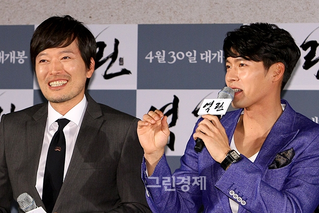 [글로벌이코노믹=유흥선기자] 배우 현빈-정재영이 2일 오전 서울 광진구 롯데시네마 건대입구에서 열린 영화 '역린'(제공/배급: 롯데엔터테인먼트, 제작: 초이스컷 픽처스, 감독 이재규)의 제작보고회에서 캐릭터를 소개하고 있다.