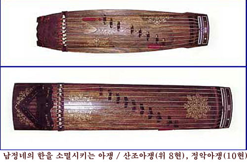 텔레비전 사극에서는 가끔 오열하는 듯한 소리가 터져 나올 때 쓰이는 악기 아쟁, 격정적인 슬픔이 이어질 때 듣는 이의 가슴이 미어지도록 하는 아쟁. 이 오열하는 듯한 아쟁의 슬픔은 아녀자의 슬픔이 아닌 남정네의 눈물이라고 흔히 말합니다. 그것은 가볍고 높은 소리가 아닌 무겁고 장중한 소리이기 때문일 것입니다. 더구나 아쟁은 늪에서 허우적거리다 스스로 매몰되는 그런 한이 아니라 오히려 그 한을 뛰어 넘어 급기야는 한 자체를 소멸시켜버리는 위대함일 것입니다. 남정네들이여, 남정네라는 죄 때문에 펑펑 울지 못한 분들은 한의 정서를 대변해주는 아쟁산조 음악을 들어볼까요?