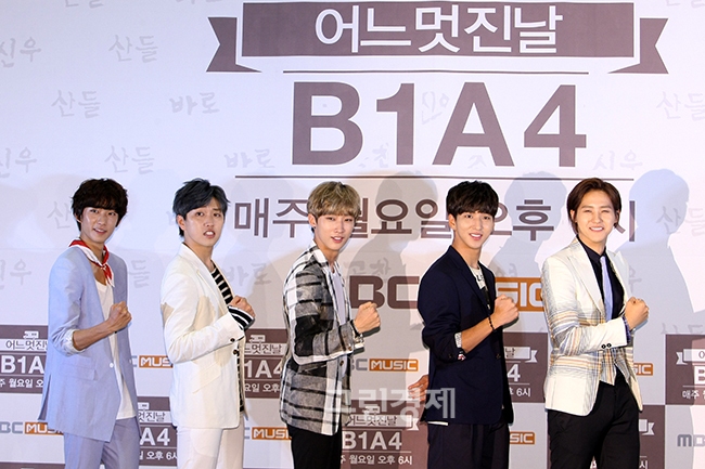 [글로벌이코노믹=유흥선 기자] B1A4가 16일 오후 서울 영등포구 IFC몰 여의도 CGV에서 열린 MBC뮤직 제작발표회에 참석해 포즈를 취하고 있다.