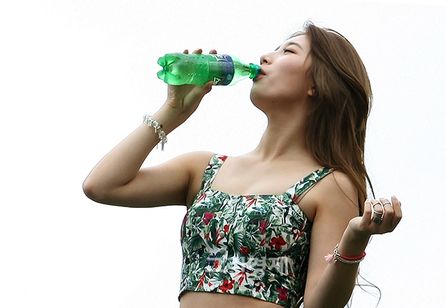 이날 수지는 TV 광고에서 선보여 화제를 모은 스프라이트 샤워 댄스의 한 장면과 물총을 든 쿨섹시 포즈를 연출해 팬들의 시선을 고정시켰다.