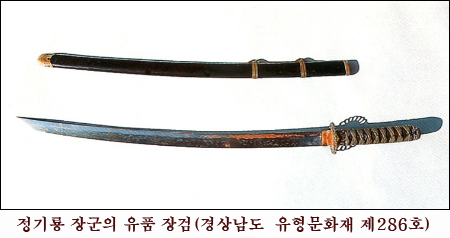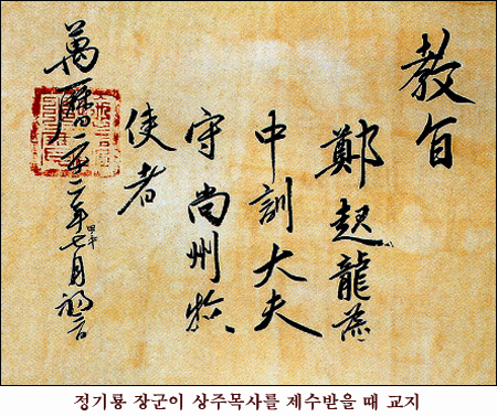 정기룡 장군은 그다지 알려지지 않았지만 실제로는 이순신 장군에 버금갈 만큼 큰 무공을 세운 장군입니다. 그는 1590년 경상우도 병마절도사 신립의 휘하에 들어가 훈련원 봉사(奉事)가 된 이래 1592년 임진왜란 때 별장(別將)으로 승진하여 거창에서 왜군을 격파하고 금산싸움에서 포로가 된 조경을 구출한 뒤 곤양의 수성장(守城將)이 되지요. 그 뒤 1597년 정유재란이 일어나자 토왜대장(討倭大將)이 되어 고령, 성주, 합천 등에서 눈부신 활약을 합니다. 1617년 3도통제사 겸 경상우도수군절도사에 올라 통영(統營) 진중에서 병사하였는데 그의 유품이 지금껏 전해오고 있습니다. 이 유품은 문중이 보관해 오다가 1989년부터 경상남도 하동의 경충사 기념관에서 보관 전시하고 있으며 유품 가운데는 교서, 장검, 임금이 벼슬을 내릴 때 발급하는 명령서인 유서 등이 전해옵니다.
