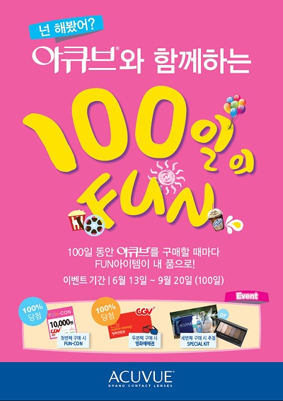 이번 기간 동안 안경점에서 아큐브 제품을 구매하면 첫 번째 구매 시에는 빕스, CGV, 투썸플레이스 등에서 사용할 수 있는 1만원 상당의 100% 당첨 Fun-con이, 2번째 구매 시에는 100% 당첨 CGV 영화예매권이 증정된다