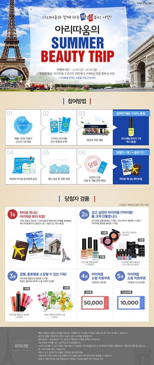아모레퍼시픽의 토털뷰티솔루션 전문매장 아리따움은 8월 24일까지 고객사은 이벤트 ‘썸머 뷰티 트립’을 진행, 제품 구매시 금액 1만원당 스티커를 한 장씩 제공해 10개의 스티커를 부착한 쿠폰을 매장에 응모하면 이벤트에 참여한다.