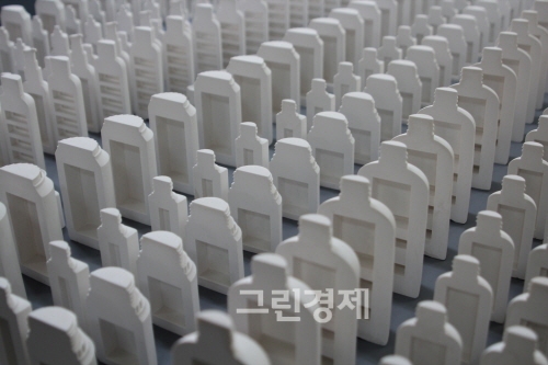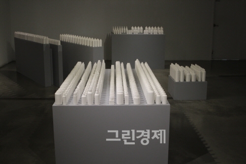 그녀가 석고로 깎아 내린 수많은 작품들은 ‘아파트’로 지칭되는 세트 메뉴, 대량 생산 상품들의 획일적 이미지를 직설적으로 보여준다. 도시의 건물들 안에서 규칙적으로 찍혀 나오는 기호, 무늬, 사각형의 모형은 생존 공간에 대한 설명이며, 그것들을 바탕으로 단순히 ‘한 장이 아닌 중첩된 콜라주’처럼 작고 큰 틀의 여러 이미지들의 조합을 오브제에 투영시킨다.
