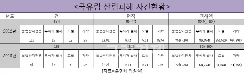 윤명희 새누리당 의원은 국내 국유림에서는 벌목뿐 아니라 무단출입 자체가 불법임에도 관리소홀로 인해 산림피해 사건이 끊이지 않고 발생하고 있다고 12일 밝혔다.윤 의원이 조사한 '국유림 산림피해 사건현황'에 따르면 지난해 136건의 단속건수 중 구속 건수는 0건, 미처리 건수는 50건으로 검찰송치 이후에도 권한이 없다는 이유로 미처리 사유조차 파악하고 있지 않은 것으로 나타났다.