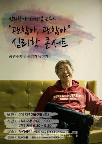 이미지 확대보기오후 2시와 오후 6시30분 두 차례 공연되는 이번 심리학 콘서트의 공연주제는 '우리가 남이가?'. 특히 심리학 강의실에서도 듣기 어려웠던 한국 문화와 한국인의 심리를 주제로 하는 이번 콘서트는 문화심리학을 국내에서 처음 강의하기 시작한 한성열 교수에게서만 들을 수 있는 경륜이 묻어나는 강의가 될 것으로 벌써 많은 사람들의 관심을 끌고 있다.