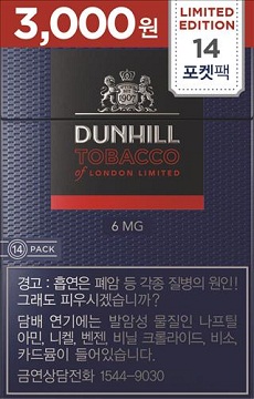 이미지 확대보기던힐 6MG 포켓팩의 타르 함량은 6.0mg, 니코틴 함량은 0.60mg이고 가격은 3000원(14개비)이다.