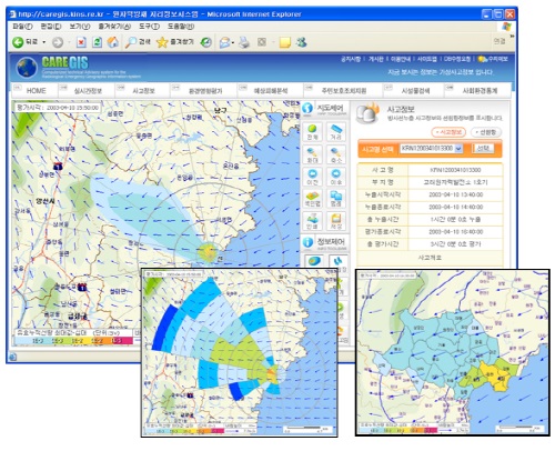 기존의 Care(Computerized Technical Advisory System for the Radiological Emergency) 시스템에 국산 GIS기술을 적용해 지난 2004년 개발되어 현재까지 발전되어온 Web GIS방식의 방재대응시스템이다. 수년 전 국제원자력기구(IAEA)가 우리나라를 방문했을 때 ‘세계적 수준의 뛰어난 시스템’이라고 칭찬했던 바로 그것이다. [그림2]에 보이는 것처럼 AWS라는 기상장비와 예측평가를 위한 방사선피폭영향 평가시스템(FADAS)에 의한 평가 결과를 토대로 주민의 방사선 피폭 최소화를 위한 주민 보호 조치와 대응 수단의 결정을 지원한다. 이를 위해 원전 부지의 공간정보와 연계된 방사능 사고 관련 정보 및 방재 관련 정보를 제공한다.