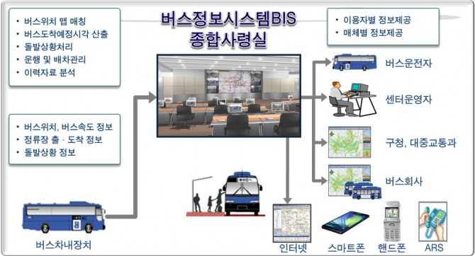 버스에 정보통신 단말기를 설치하여 위성항법장치(GPS: Global Positioning System)로 인공위성과 연결하는 방식을 채택했다. 버스정보 관리센터가 거리의 버스들의 운행정보를 취합한 후 종합적으로 디지털 지도 위에 표시하고 필요로 하는 곳으로 정보를 보내 공유하는 방식이었다. 또한 버스의 운행 관련 정보를 버스정류장마다 설치된 디지털 안내판을 통해 국민들에게 제공했다. 승객들 누구나 각자가 기다리는 버스가 몇 분 후에 도착하는지 정확히 알 수 있게 된 것이다. 심지어 승차 중인 승객들도 각자의 목적지까지 소요되는 시간과 도착시간을 알 수 있었다.