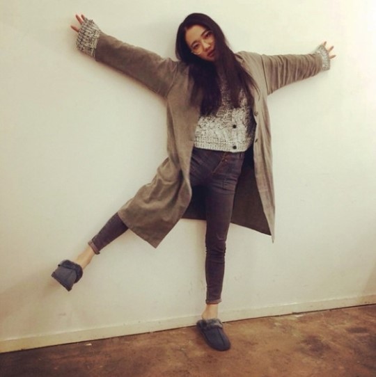 공개 된 사진 속 손수현은 따뜻한 느낌을 주는 아이보리 니트와 스키니 진, 그레이 컬러의 털 실내화를 신은 수수한 패션 스타일을 보이고 있다.