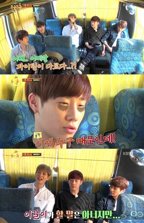 이날 성규는 지난 밤 규현의 코골이에 시달려 잠을 못 잤다고 털어놨다. 규현릉 성규에게 “컨디션이 더 안 좋아 보인다”며 걱정했고, 이에 성규는 “인도가 날 이렇게 만들었다. 코골이 테러를 당했다”며 규현을 원망했다.