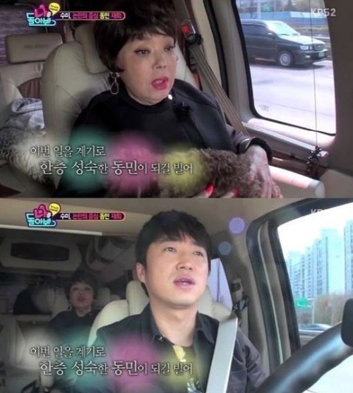 이미지 확대보기지난 24일 오후 방송된 KBS2 예능프로그램 ’나를 돌아봐’에서는 논란을 겪은 장동민에게 따뜻하고도 현실적인 조언을 건네는 김수미의 모습이 그려졌다.