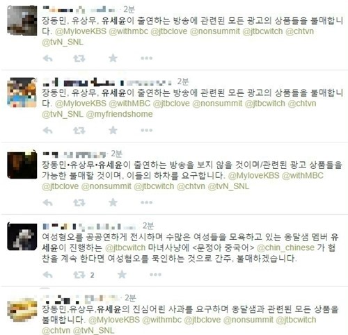이에 네티즌들 사이에서는 "장동민, 유세윤, 유상무가 출연하는 방송에 관련된 모든 광고의 상품을 불매합니다"라는 글이 퍼져나가고 있다.