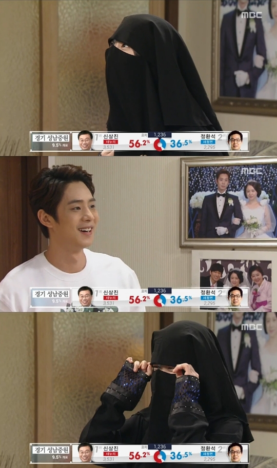 이미지 확대보기29일 방송된 MBC 일일드라마 '압구정백야'(극본 임성한 연출 배한천) 137회에서 육선지(백옥담)는 시아버지 장추장(임채무)이 사온 니캅을 쓴 채 등장했다.
