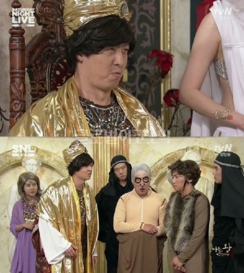 이날 '나는 왕이로소이다' 코너에서 유상무는 왕 역할을 맡아 자신 보다 웃긴 광대를 처형했다.