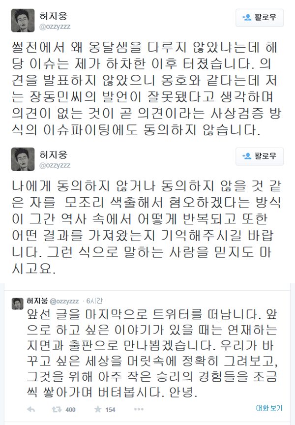 이어 허지웅은 "앞선 글을 마지막으로 트위터를 떠납니다"라며 "하고 싶은 이야기가 있을 때는 연재하는 지면과 출판으로 만나뵙겠습니다"라고 딱 잘라 말했다.