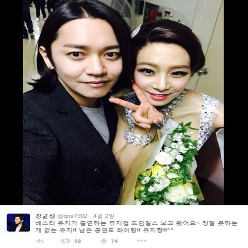 이미지 확대보기강균성은 지난 2일 자신의 트위터에 "베스티 유지가 출연하는 뮤지컬 드림걸스 보고왔어요~정말 못하는 게 없는 유지!! 남은 공연도 화이팅!!유지짱!!^^"이라는 글과 함께 한 장의 사진을 게재했다.