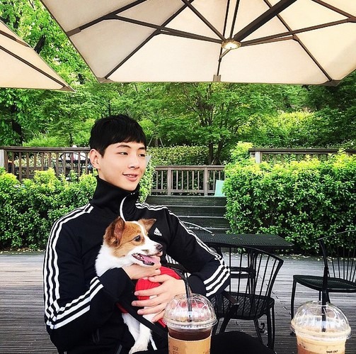 검은 져지를 입고 편안한 차림을 한 지수는 강아지 한 마리를 품에 안고 가벼운 미소를 띤 모습이다.