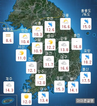 전국이 대체로 흐리고 강원도영서와 경상북도, 경남해안에는 비(강수확률 60~70%)가 오다가 아침에 대부분 그치겠으나, 서울.경기도와 강원도영서는 늦은 오후부터 밤 사이에 가끔 비(강수확률 60~70%)가 오는 곳이 있겠다.