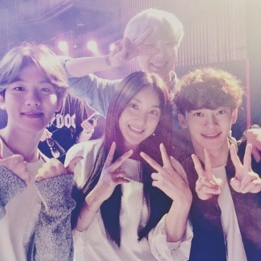 공개된 사진 속에는 바다와 엑소의 백현 찬열 첸의 모습이 담겼다. 찬열은 윙크를 하고 있고, 백현은 양손 엄지를 들고 있으며, 첸은 브이 포즈를 취하고 있다. 바다는 이들 사이에서 밀리지 않는 동안 외모를 과시하며 훈훈한 선후배 사이를 보여줬다.